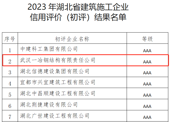 1月3日,湖北省建筑業(yè)協(xié)會公布了2023年度湖北省建筑施工企業(yè)信用評價結(jié)果名單,中國一冶鋼構(gòu)公司獲評“湖北省建筑企業(yè)AAA級信用企業(yè)”。